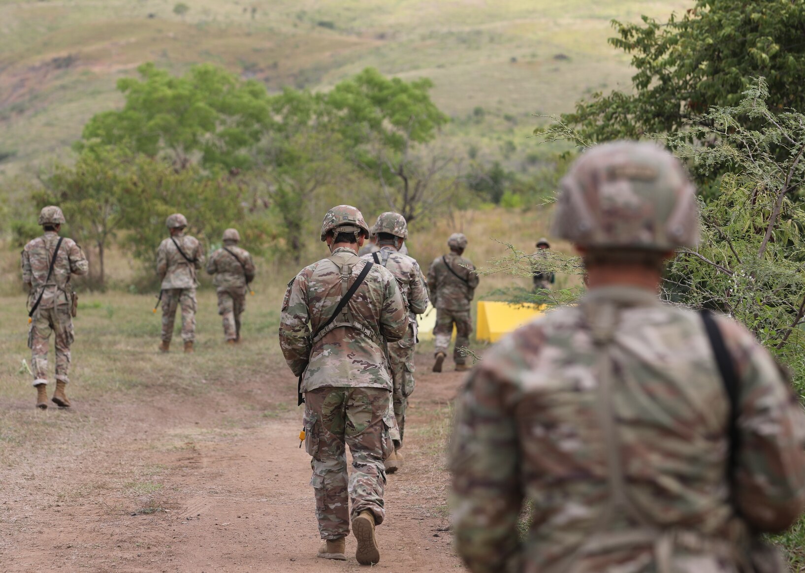 U.S. Army Reserve Soldiers assigned to the 1st Mission Support Command, walking to the start point of a Caribbean Thunder 25 Situational Training Exercise (STX) lane in Camp Santiago, Salinas, Puerto Rico, Aug 4, 2025. Caribbean Thunder is an annual exercise designed to train and prepare units for supporting Large-Scale Combat Operations (LSCO), enhance its warfighting readiness, and ability to respond to crisis or conflict. (U.S. Army Reserve photo by Sgt. Edrik Torres)