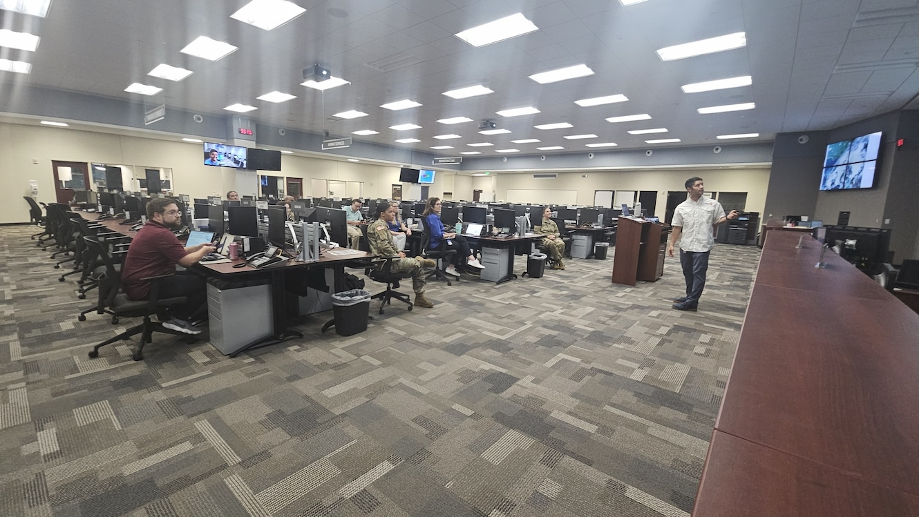 Dave Connor, Director of Communications, Pinellas County Government, gives a presentation about communications and public information lessons learned during his department's activation to support disaster preparation, relief and recovery efforts during Hurricanes Helene and Milton to Army Reserve Soldiers from the 204th Public Affairs Detachment at the Pinellas County Emergency Operations Center in Largo, Florida, Sept. 12, 2025. The tour highlighted the collaborative role between military and civilian agencies in managing large-scale emergencies. (U.S. Army photo by Sgt. Maria Henderson, 300th Mobile Public Affairs Detachment)