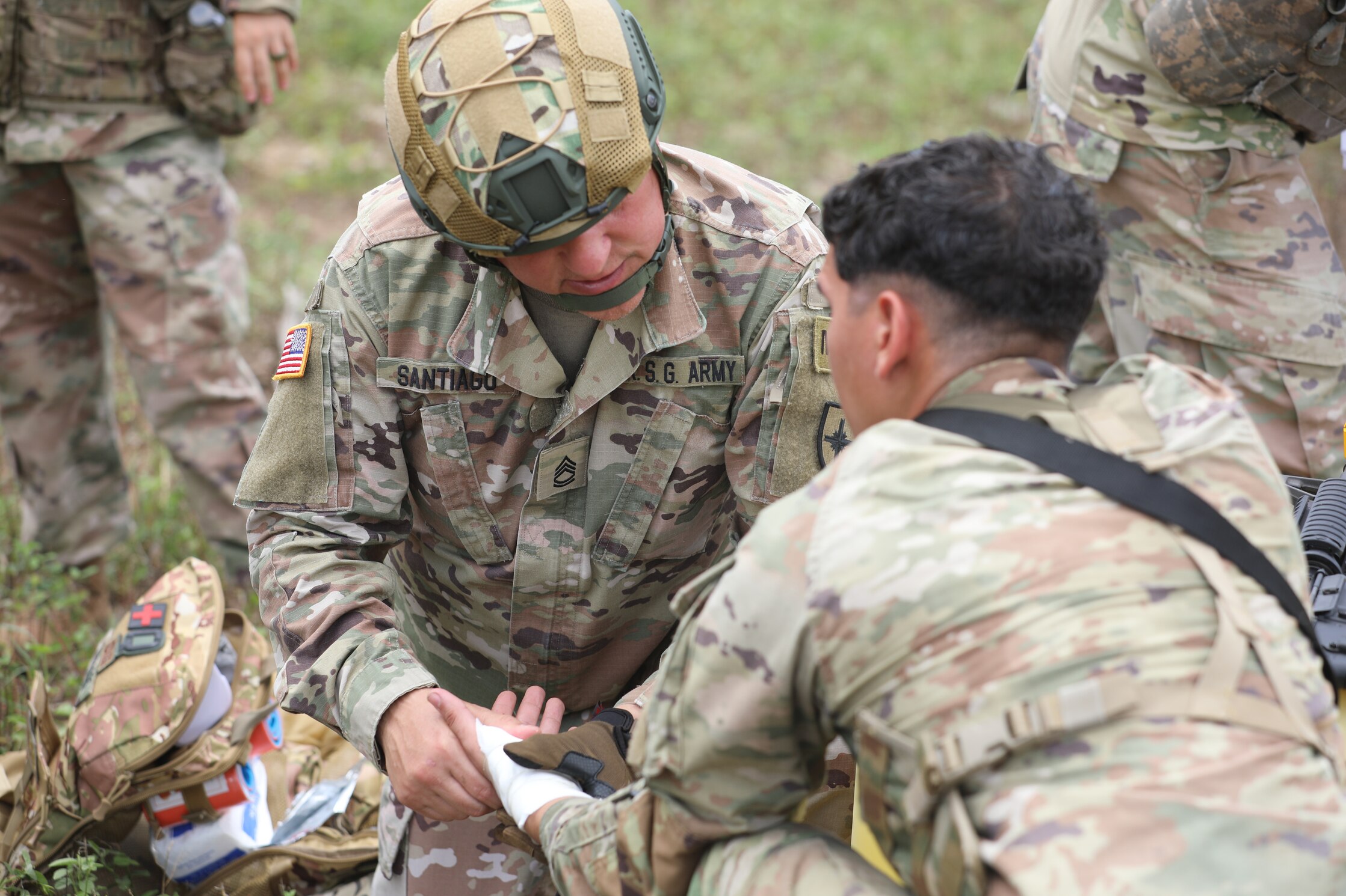 Puerto Rico State Guard Sgt. First Class Jose Santiago, combat medic specialist, gives real life medical attention during Situational Training Exercise (STX) lanes in Caribbean Thunder 25, in Camp Santiago, Salinas, Puerto Rico, Aug 4, 2025. Caribbean Thunder 25 builds and validates combat readiness amongst participating and partner units. (U.S. Army Reserve photo by Sgt. Edrik Torres)