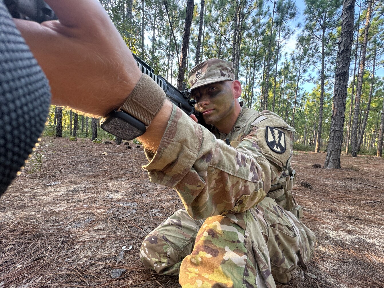 U.S. Army Reserve Drill Sergeant Staff Sgt. Christopher Trueblood, assigned to 4th Battalion, 39th Infantry Regiment, mentors trainees during “The Forge” at Fort Jackson, South Carolina, Aug. 27, 2025. The Forge is the culminating field training exercise of Basic Combat Training, testing everything trainees have learned before graduation. (U.S. Army Reserve photo by Lt. Col. Xeriqua Garfinkel)