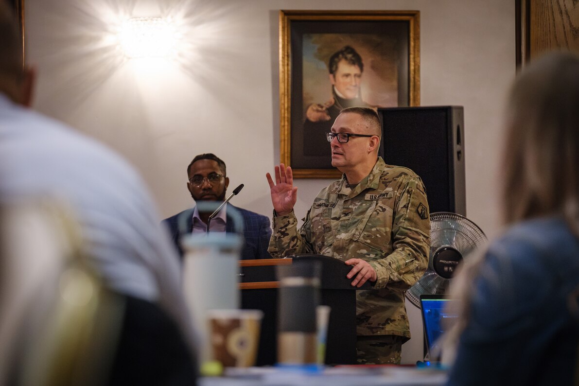 U.S. Army Reserve Col. Charles Moulton, the 7th MSC deputy commanding officer, delivers his remarks to open the command’s three-day "resiliency summit" Sept. 10, 2025, at Sembach Kaserne, Germany. The event, held with the 21st Theater Sustainment Command and the 86th Airlift Wing, brought together Soldiers, civilians and members of the Kaiserslautern military community for training, team-building activities, briefings and discussions focused on prevention and safety. (U.S. Army Reserve photo by Staff Sgt. Angela O’Hearn)