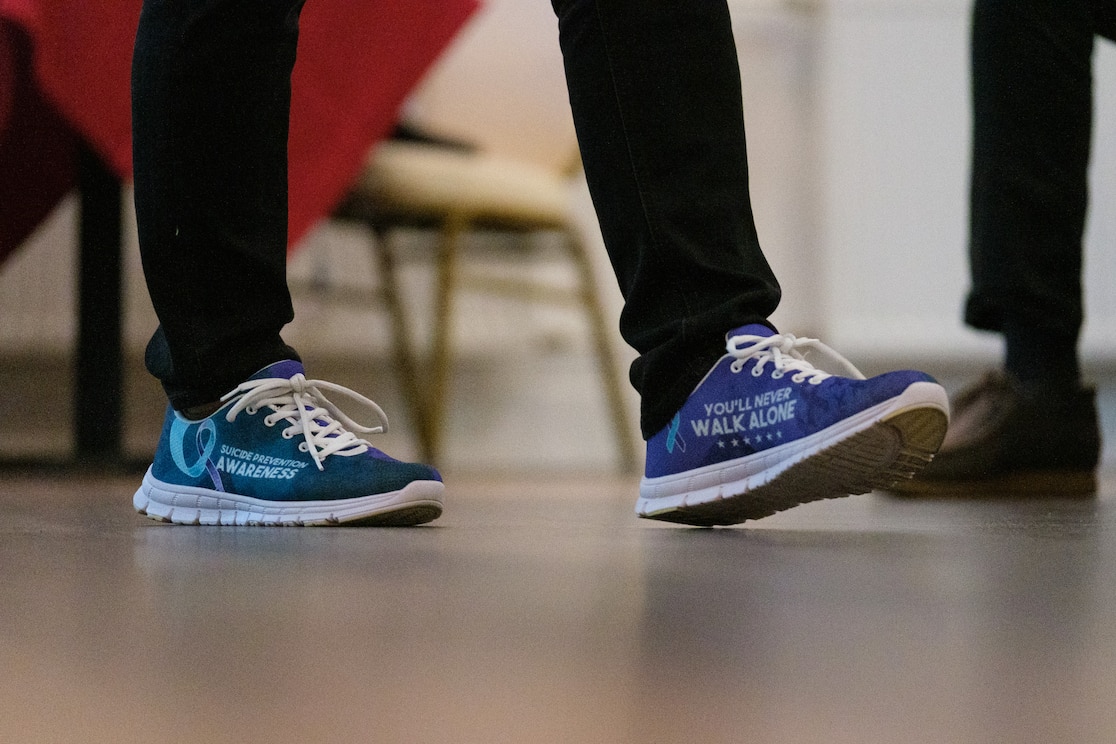 Retired Chief Warrant Officer 4 Clifford Bauman, now an author and self-described “mental-health warrior,” wears suicide-prevention awareness sneakers as he speaks about surviving his suicide attempt as part of the 7th Mission Support Command’s three-day "resiliency summit" Sept. 11, 2025, at Sembach Kaserne, Germany. Bauman detailed his experience as a 9/11 volunteer first responder, his PTSD and how he overcame his mental-health challenges during his presentation. (U.S. Army Reserve photo by Staff Sgt. Angela O’Hearn)