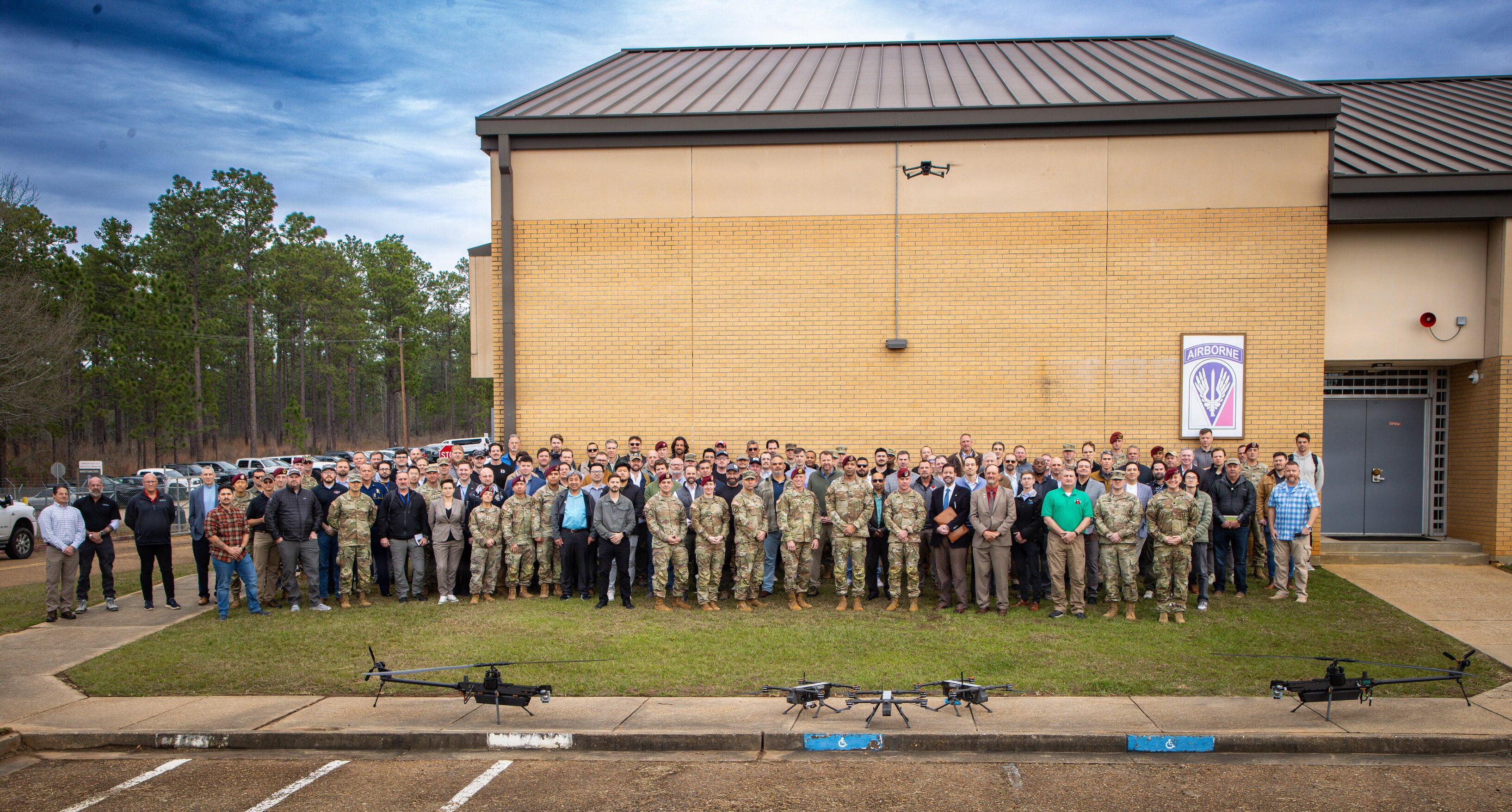 Atendees of the Innovation Industrial Conference, along with JRTC and Fort Polk leadership, pose for a group photo Jan. 14 at Fort Polk, La. (U.S. Army photo by Porsha Auzenne)