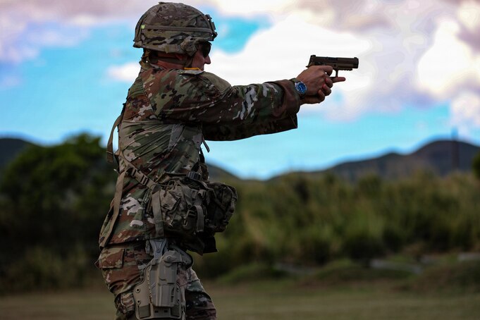 U.S. Army Reserve Soldiers from the 402nd Civil Affairs Battalion, 1st Mission Support Command, conduct individual weapons qualification at Camp Santiago, Salinas, Puerto Rico Jan. 10, 2026. The Army of the Caribbean Week, the first event of its kind in the region, underscores the commitment to duty and readiness within the Caribbean. (U.S. Army Reserve photo by Staff Sgt. Bryanne Vega)