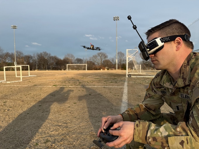 The Army Reserve Aviation Command's1st Lt. Joshua Goff launches a first-person view (FPV) drone during the Best Operator Competition at the first Army Best Drone Warfighter Competition 17-19 February 2026 in Huntsville, AL.
