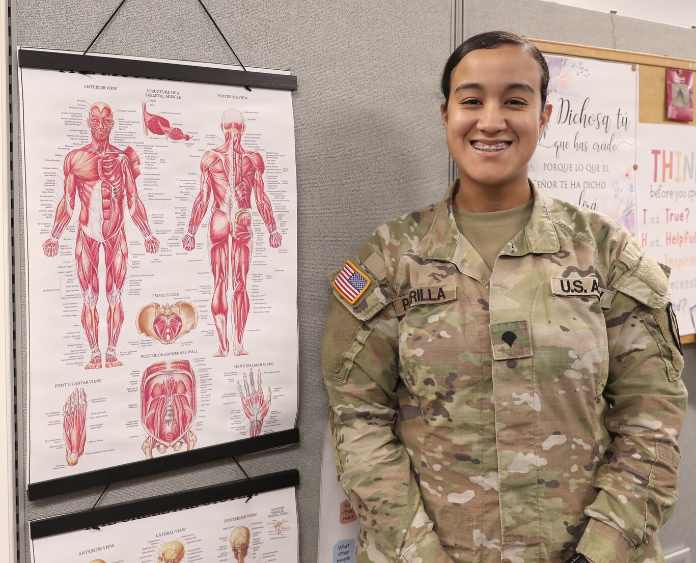 U.S. Army Reserve Spc. Angelica Parrilla, assigned to Surgeons office from the 1st Mission Support Command, poses next to her office cubicle diagram of the human body. (U.S. Army Reserve photo by Spc. Eric Javier II Amaro-Millan).