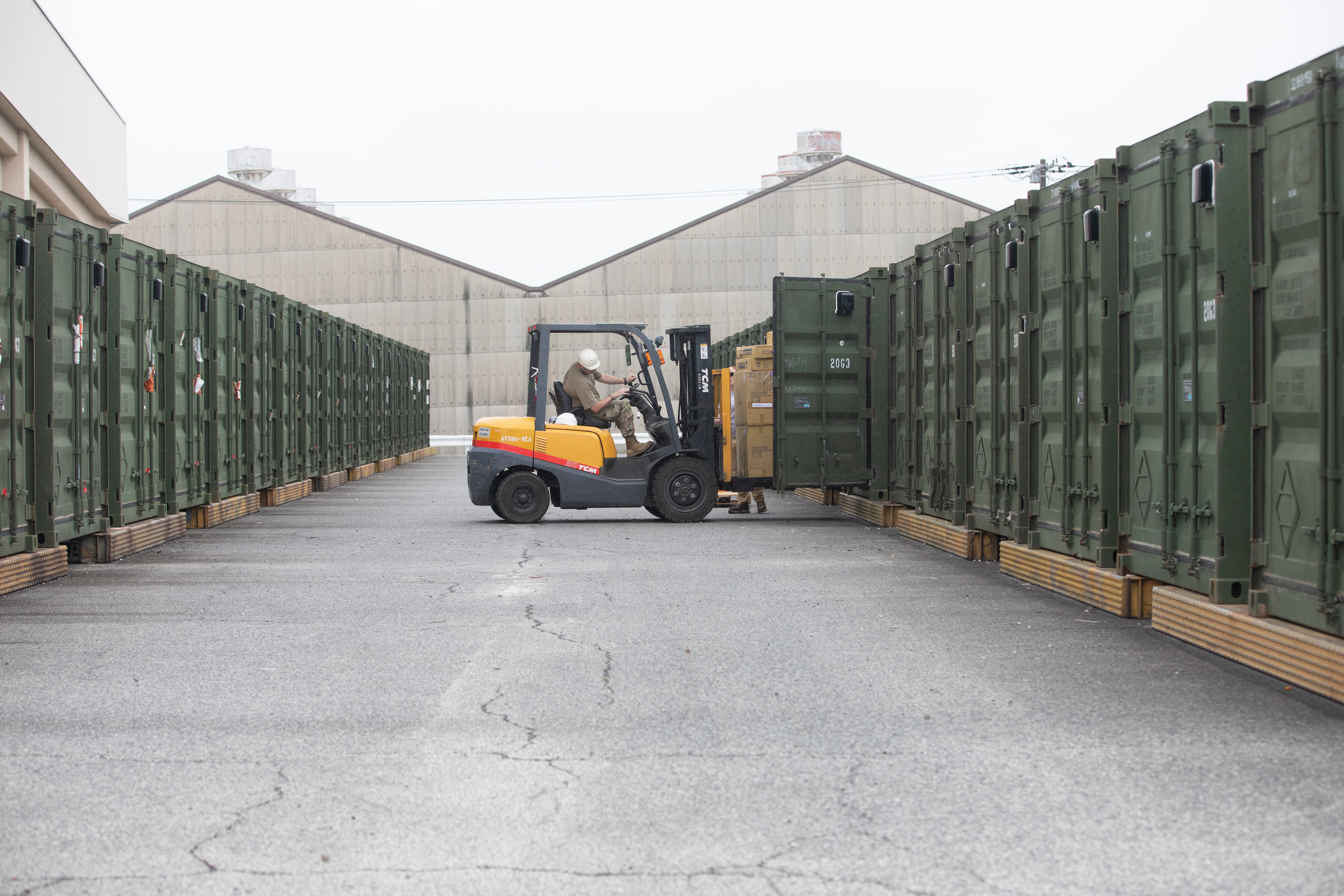 U.S. Army Staff Sgt. Preston Cook, a medical logistics specialist assigned to the 308th Medical Logistics Company, 145th Multifunctional Medical Battalion, 2nd Medical Brigade, uses a forklift to load a shipping container at Sagami Supply Depot in Sagamihara, Japan, July 14, 2025. Operation Patriot Press is a large-scale, multi-component logistics exercise that provides realistic training opportunities for the US Army Reserve, National Guard, and active-duty components to enhance their logistical acumen and readiness. (U.S. Army photo by Staff Sgt. Ian Valley)