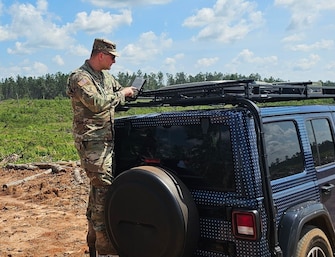 Chief Warrant Officer 3 Nicholas Chadwick, innovation digital engineer, Detachment 5, Support Group, 75th U.S. Army Reserve Innovation Command enters survey assessment and evaluation data into a Behavioral Observation Logging Toolkit hand-held tablet about the Multi-Orbit Tactical Terminal satellite communications for on-the-move lower earth orbit and geosynchronous earth orbit dual configurable ground station transceivers for enhanced and resilient network primary alternate contingency emergency technology, during Cyber Quest 25, June 6, 2025, at Fort Eisenhower, Georgia. Cyber Quest is an annual data-centric Army Focused Warfighting Experiment providing capability development and acquisition communities a unique, realistic and future-focused operationally relevant environment to inform critical capability gaps facing Cyber, Electromagnetic Warfare, Information Advantage and Signal operational forces. The experiment will drive requirements definition, inform rapid acquisition initiatives and support acquisition risk reduction activities. (Photo by Curtis Cato, communication requirements developer, Cyber-CDID/Army Capability Manager Network and Services)
