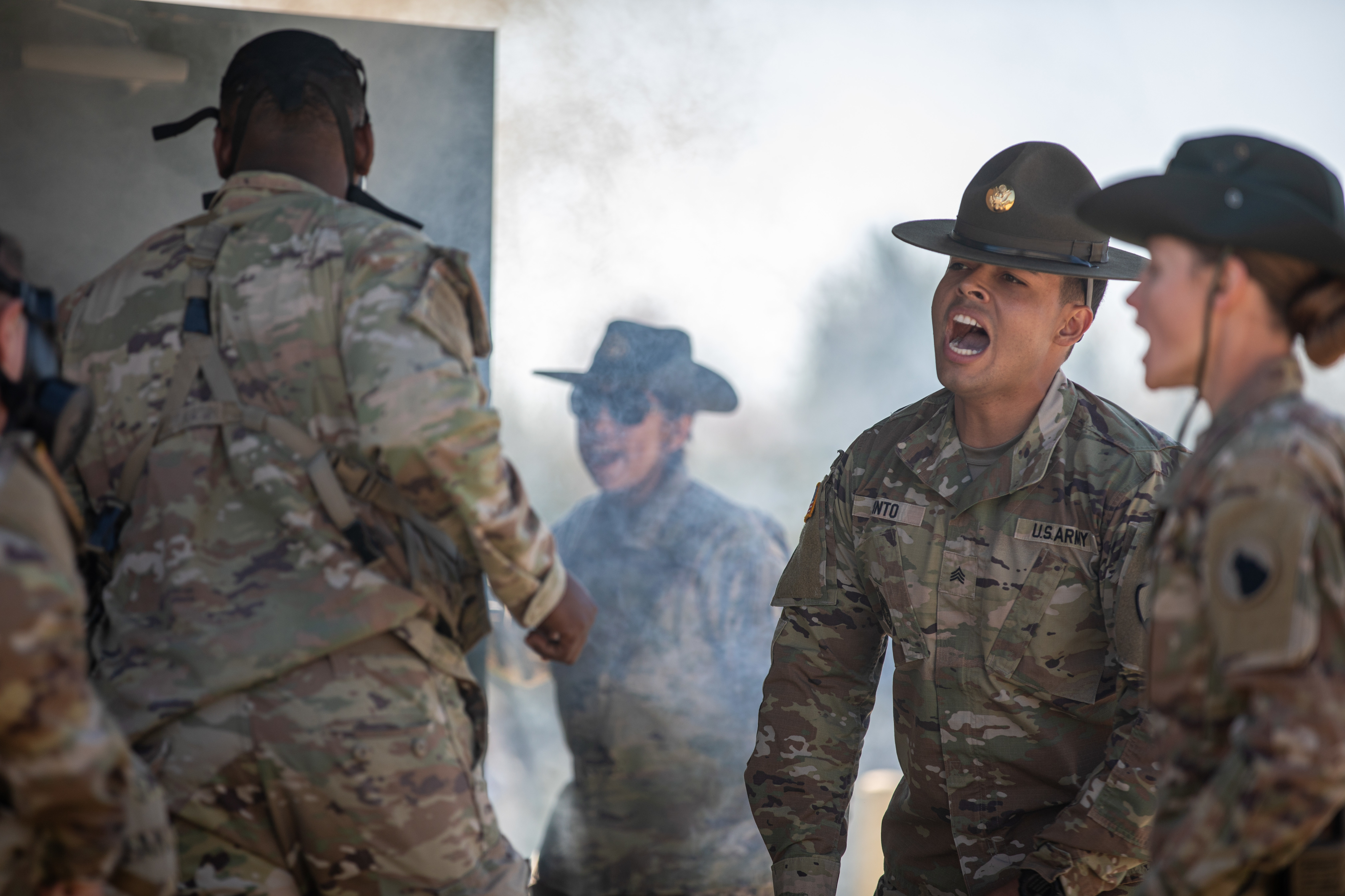 Army Reserve Best Squad competitors run inside a dark smoke filled room where they are tasked to memorize items on a table during the mystery event at Fort McCoy Wisconsin, May 10, 2025. Soldiers from around the nation compete in the 2025 BSC, an annual competition that brings together the best Soldiers and squads from across the U.S. Army Reserve to earn the title of “Best Squad” among their peers. (U.S. Army Reserve photo by Staff Sgt. Mikayla Fritz)